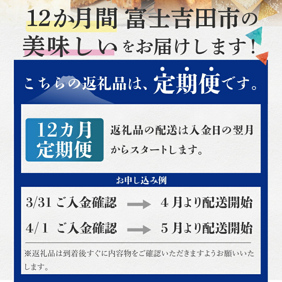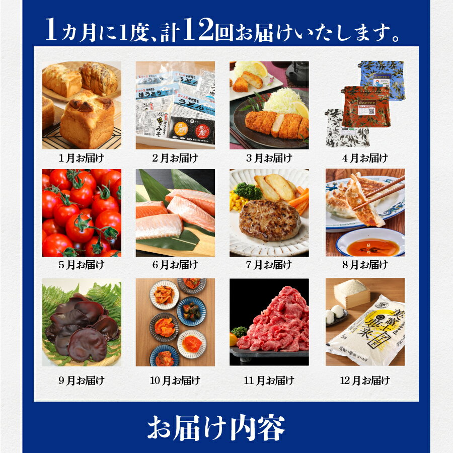 - 【ふるさと納税】 定期便 【12ヶ月お届け!】 お楽しみ 12回 肉 米 ブレッド パン カスタード うどん ほうとう 甲州富士桜ポーク 揚げ物 カツ コロッケ メンチカツ コーヒー ドリップ フルーツトマト 富士の介 魚 ハンバーグ 餃子 きくらげ キムチ ご馳走定期便