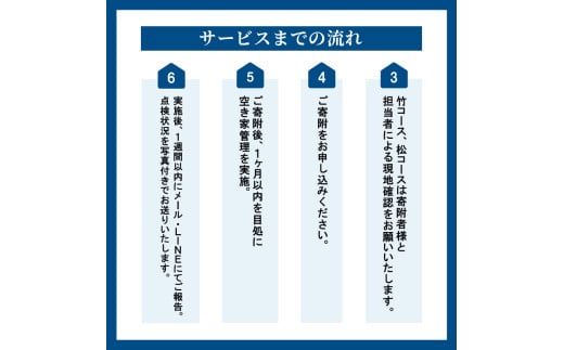 - 空き家管理 年4回 松コース 外観 門塀 植栽 雑草 不法投棄 確認 ポスト 水道 チェック 屋外簡易清掃 植栽 刈込 雑草 刈取 施錠 メーター 確認 郵便物 整理 換気 通水封水 雨漏り 点検 簡易清掃 管理看板 設置 完了 報告