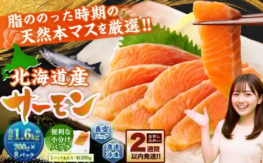 - 北海道産サーモン 約1.6kg (約200g×8パック) サーモン 本マス マス 天然 新鮮 塩締め 急速凍結 小分け 冷凍