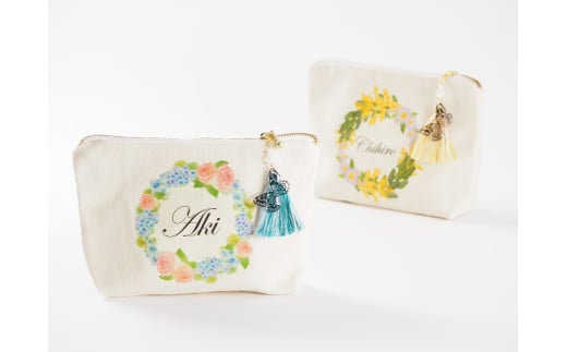 - 4月【名入れオーダー】ブルミア 誕生花が咲き続けるポーチ Mサイズ チャーム付き