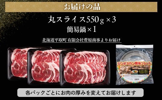 【厚さ3種類/食べ比べ/丸スライス】『ラムスライス』550g×3、大容量の1.65kg【簡易鍋付き1枚】 ふるさと納税 人気 おすすめ ランキング 羊 ラム 肉 ジンギスカン おいしい 北海道 平取町 送料無料 BRTI018