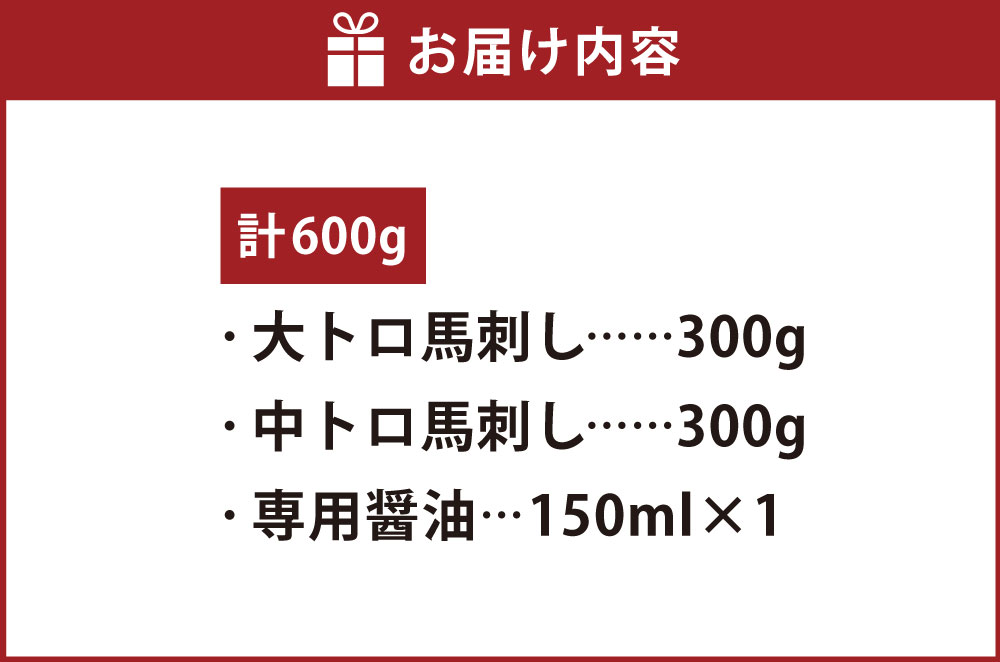 - 【ふるさと納税】【桜屋】大トロ 中トロ 馬刺し 2種 食べ比べ セット 計600g(各300g×2) 専用醤油付き:150ml×1本 馬肉 お肉 馬刺 霜降り 赤身 希少部位 しょうゆ 冷凍 熊本県 熊本市 送料無料