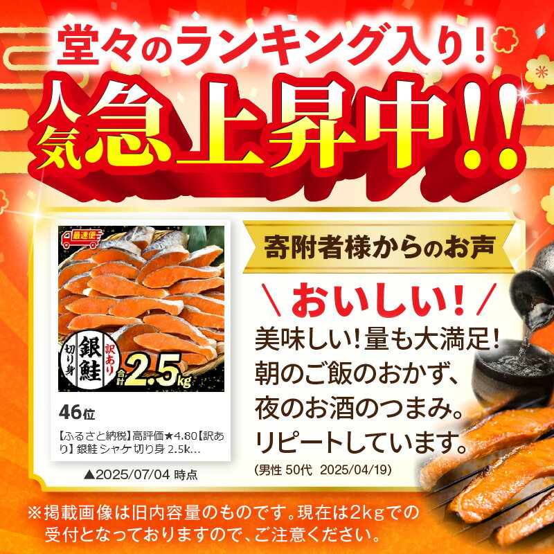 【ふるさと納税】高評価★4.80【訳あり】 銀鮭 シャケ 切り身 2kg 鮭 新鮮 魚 魚介 魚介類 熟成 脂 脂乗り お弁当 おにぎり おむすび 鮭フレーク 鮭ごはん 西京焼き 蒸し焼き ホイル焼き 家庭用 サケ 海鮮 朝食 和食 ふるさと 宮崎県 宮崎市