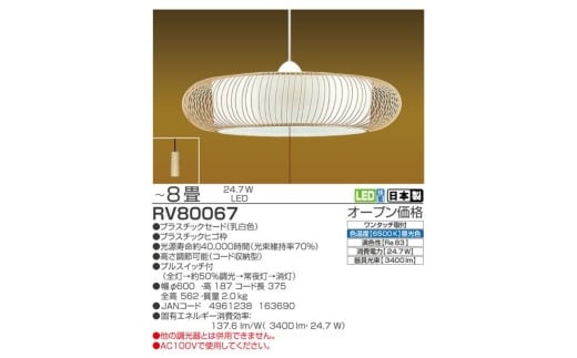 - 【RV80067】 8畳 LED和風ペンダント 調光 日本製 照明 簡単 便利 ライト 天井 寝室 和室 TAKIZUMI 瀧住電機工業