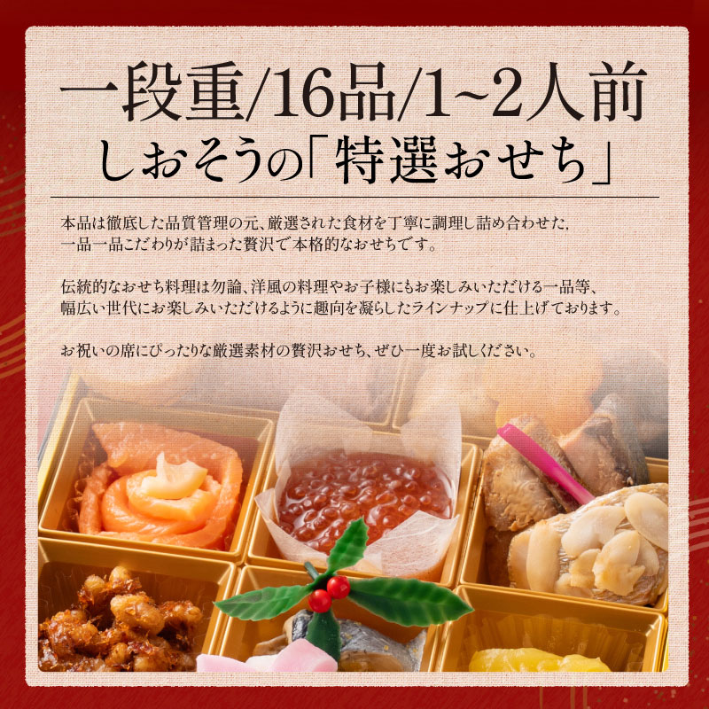 - [先行予約・数量限定] 【12月31日お届け】しおそう オリジナル 『 迎春 おせち 』 1段重 [16品 1~2人前]