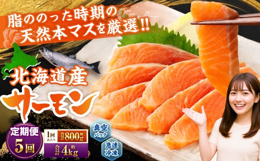 【5回定期便】 北海道産サーモン 計約4kg (約200g×4パック)×5回 サーモン 本マス マス 天然 新鮮 塩締め 急速凍結 小分け 冷凍