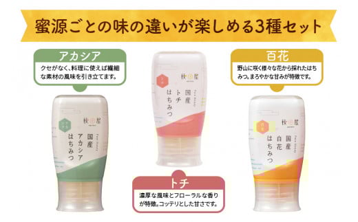 [ 国産はちみつ ] アカシア・百花・トチ ( 300g × 3本 ) はちみつ ハチミツ 蜂蜜 ハニー ボトル たれにくい 送料無料 秋田屋本店 [1017] 国産 100% 百花蜜 ギフト 贈答 とち 使いやすい容器 食べ比べ 23000円