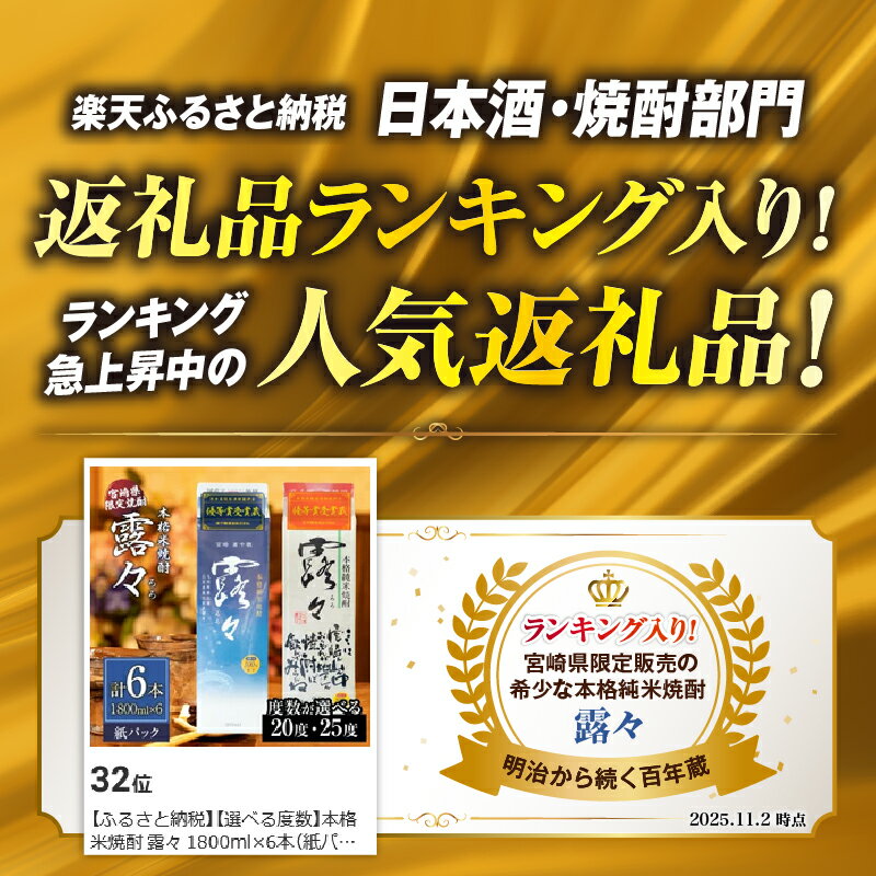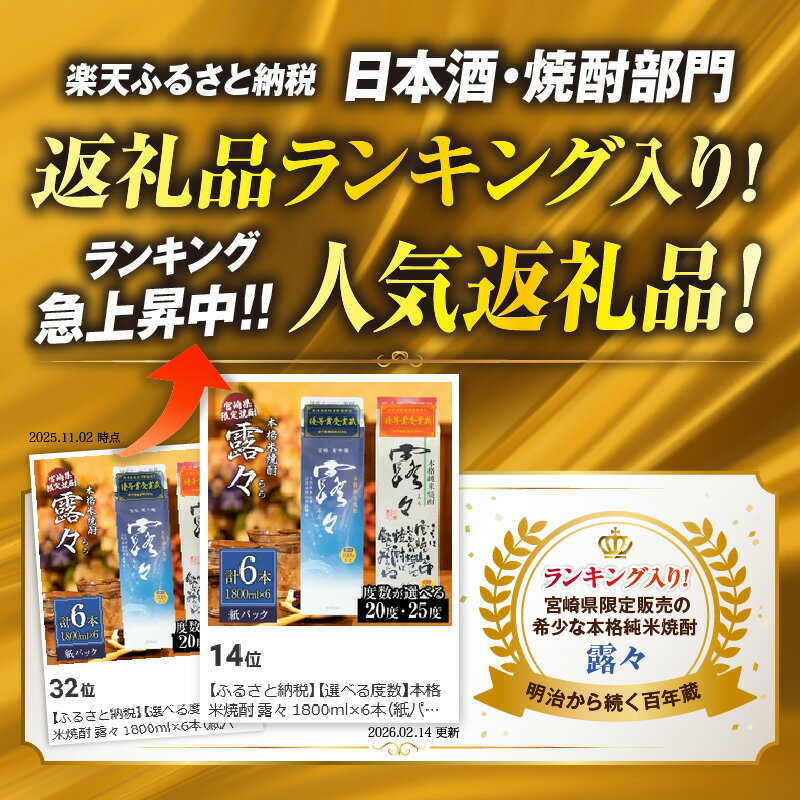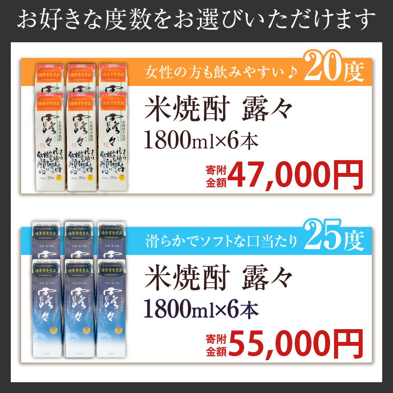 【ふるさと納税】【選べる度数】本格米焼酎 露々 1800ml×6本(紙パック) 酒 お酒 アルコール 焼酎 米焼酎 純米焼酎 贈り物 ギフト プレゼント お歳暮 お祝い 記念日 誕生日 パーティー 詰め合わせ 焼酎セット ロック お湯割り 宮崎県 高千穂町 送料無料