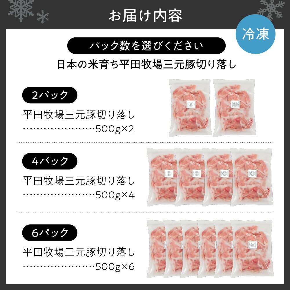 - 【ふるさと納税】 三元豚 切り落し 【 選べる パック数 】 500g 2パック 4パック 6パック 切り落とし 国産 豚肉 肉 お肉 小分け 細切れ 小間切れ 焼肉 豚丼 生姜焼き すき焼き 旨味 日本の米育ち 平田牧場 贈り物 プレゼント ギフト 農林水産大臣賞 冷凍 北海道 札幌市