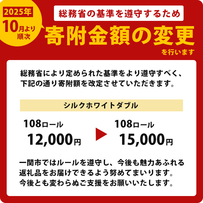 《11月発送》\配送時期が選べる/ トイレットペーパー ダブル シルクホワイト ダブル 30m 12ロール×8パック (96ロール) 18ロール×6パック(108ロール) ふるさと納税 無香料 業務用 まとめ買い 再生紙 長尺 エコ 柔らかい 人気 おすすめ 送料無料 岩手県 一関市