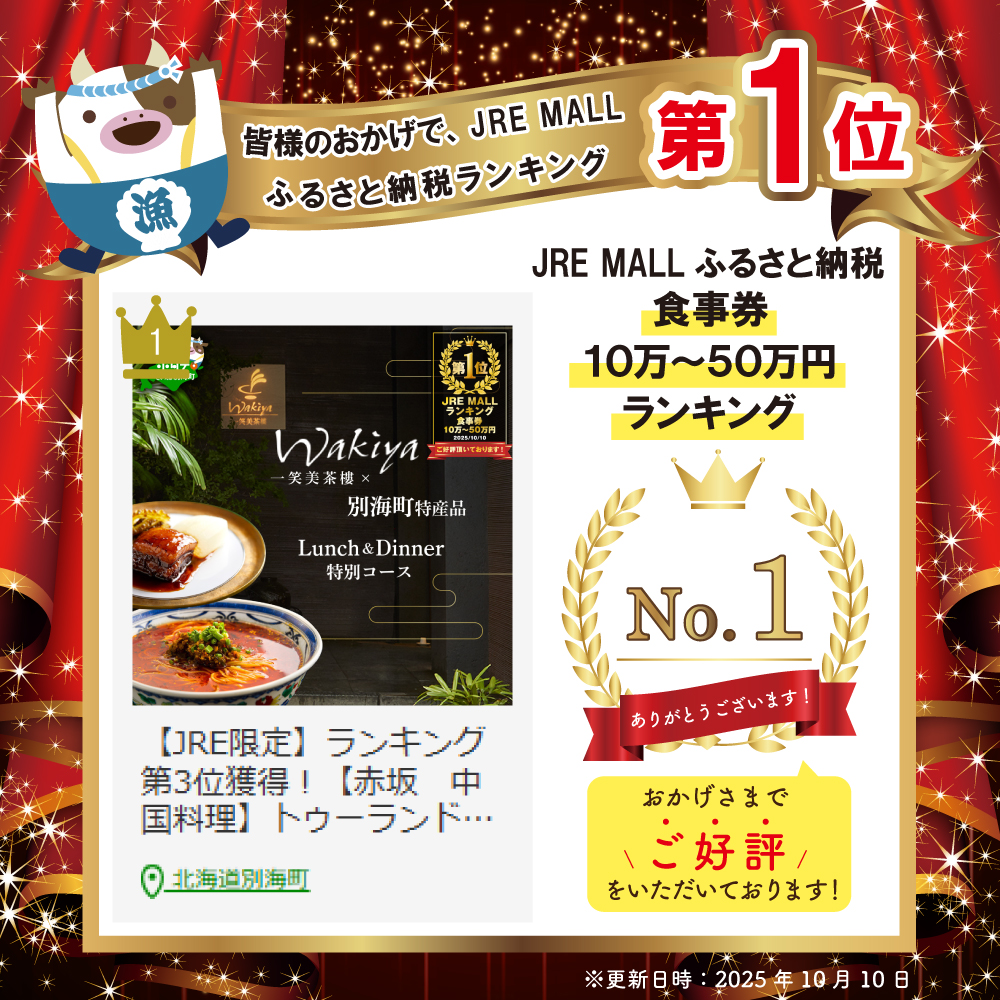 - 【JRE限定】ランキング第3位獲得!【赤坂 中国料理】トゥーランドット臥龍居 or Wakiya一笑美茶樓 別海町Aコースお食事券2名様【CC0000150】(ふるさと納税 レストラン ランチ ディナー 東京 コース料理)