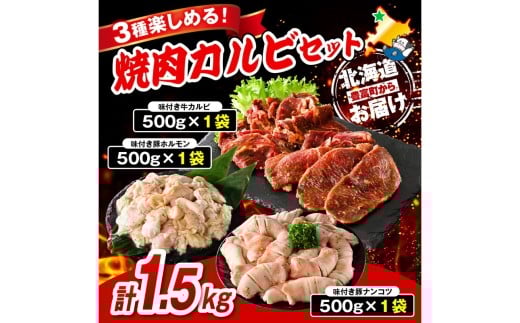 焼肉カルビセット【味付き牛カルビ+味付き豚ホルモン+味付き豚ナンコツ 各1袋 計1.5kg】