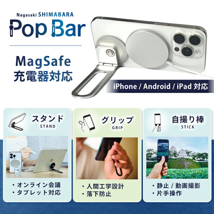 - 【ふるさと納税】3in1 多機能スマホスタンド|MagSafe対応・日本製・日米特許|外さず充電可 Pop Bar 吟醸シルバー BG062|長崎県島原市