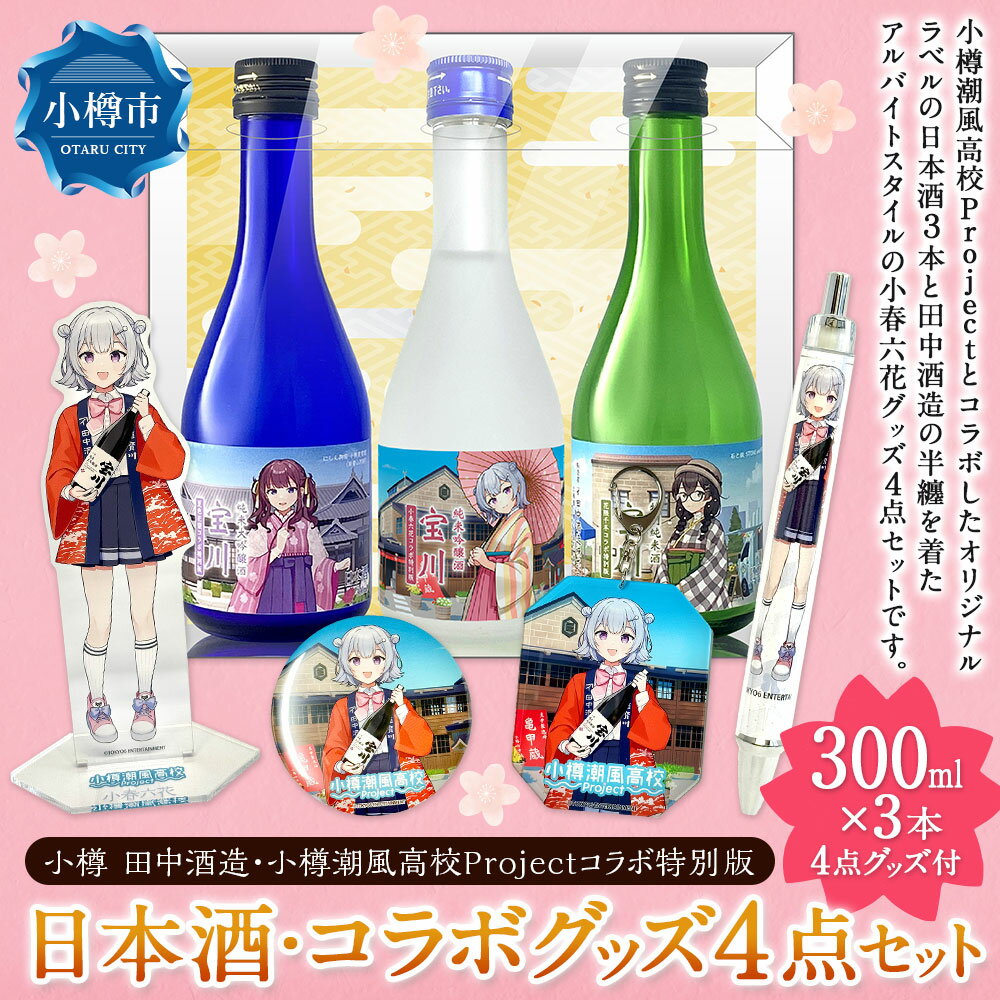 - 【ふるさと納税】【小樽 田中酒造】小樽潮風高校Project コラボ特別版 日本酒(300ml×3本(小春六花・夏色花梨・花隈千冬))・コラボグッズ4点セット(小春六花ver.) 純米吟醸酒 宝川 米こうじ 米麴 お酒 地酒 飲料 小物 雑貨 北海道産 国産 北海道 小樽市 送料無料