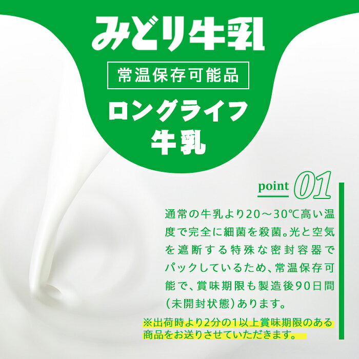 - 【ふるさと納税】<お届け回数が選べる!>みどり牛乳(計12L、計36L・毎月3回、計36L・隔月3回、計72L・隔月6回) 定期便 常温 保存 ミルク 生乳 長期保存 ロングライフ 乳製品 防災 備蓄 大分県 佐伯市【GT02・GT04・GT05・GT06】【九州乳業株式会社】