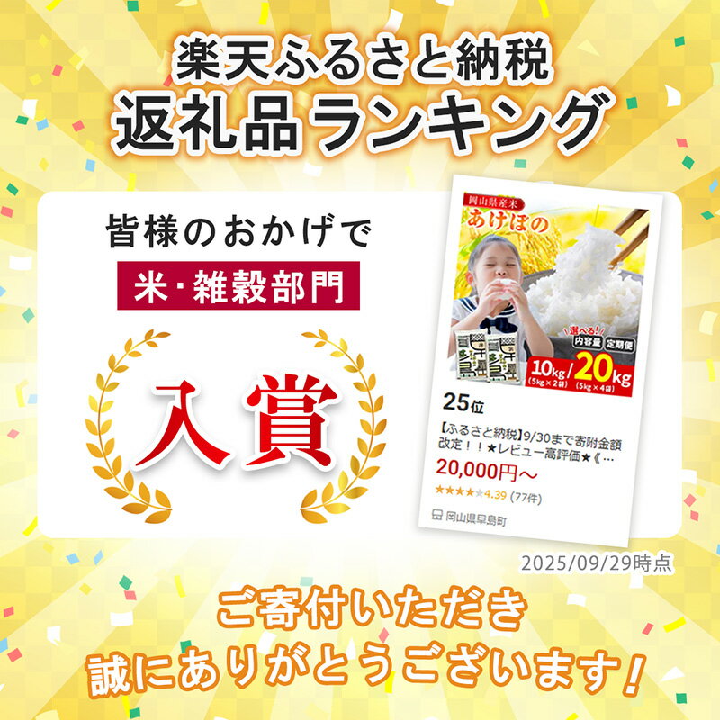 - 【ふるさと納税】★レビュー高評価★《 選べる内容量 /発送回数/発送月》 10kg(5kg×2袋)20kg(5kg×4袋)定期便 1回 2回 3回 6回 9回 令和7年産 新米 岡山県産 あけぼの 先行予約 米 こめ kome 定期便 発送時期が選べる 楽天限定