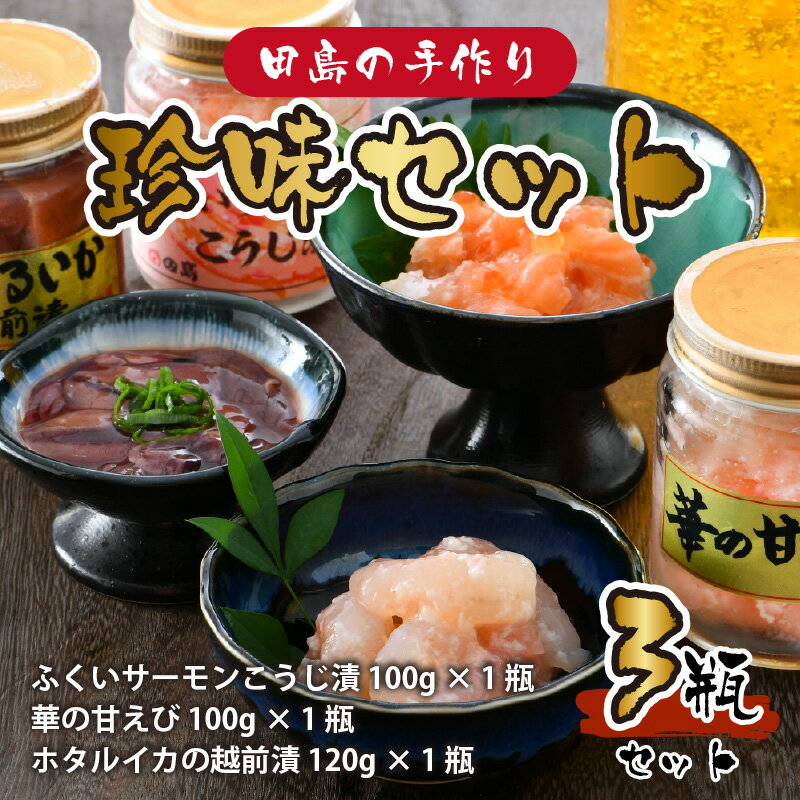 - 【ふるさと納税】ふくいサーモンこうじ漬 ・ 華の甘えび ・ ほたるいか越前漬セット 3瓶【麹 糀 いくら 甘エビ 三国 ホタルイカ 珍味 福井県産】