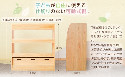 可動式の棚 (おもちゃ箱3個付き)幅82×奥行38×高さ90cm インテリア 木製 日本製 家具 木製