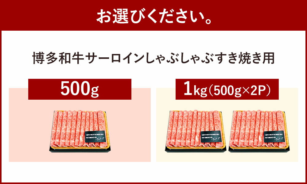 - 【ふるさと納税】<選べる内容量>【厳選部位・A4ランク以上】博多和牛 サーロイン しゃぶしゃぶ・すき焼き用 500g×1パック・計1kg(500g×2パック) 黒毛和牛 牛肉 お肉 スライス すきやき 化粧箱 冷凍 福岡県産 国産 九州 福岡県 直方市 送料無料