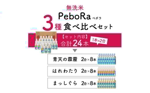 無洗米 青森県産米セット(青天の霹靂、まっしぐら、はれわたり) Pebora 2合(300g)×24本