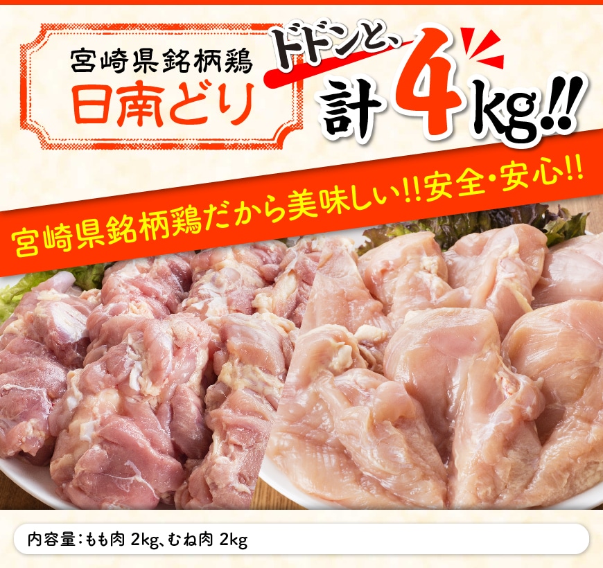 - 宮崎県産若鶏 日南どり もも肉&むね肉 計4kg(各2kg×1) 鶏肉 もも むね[C05308]