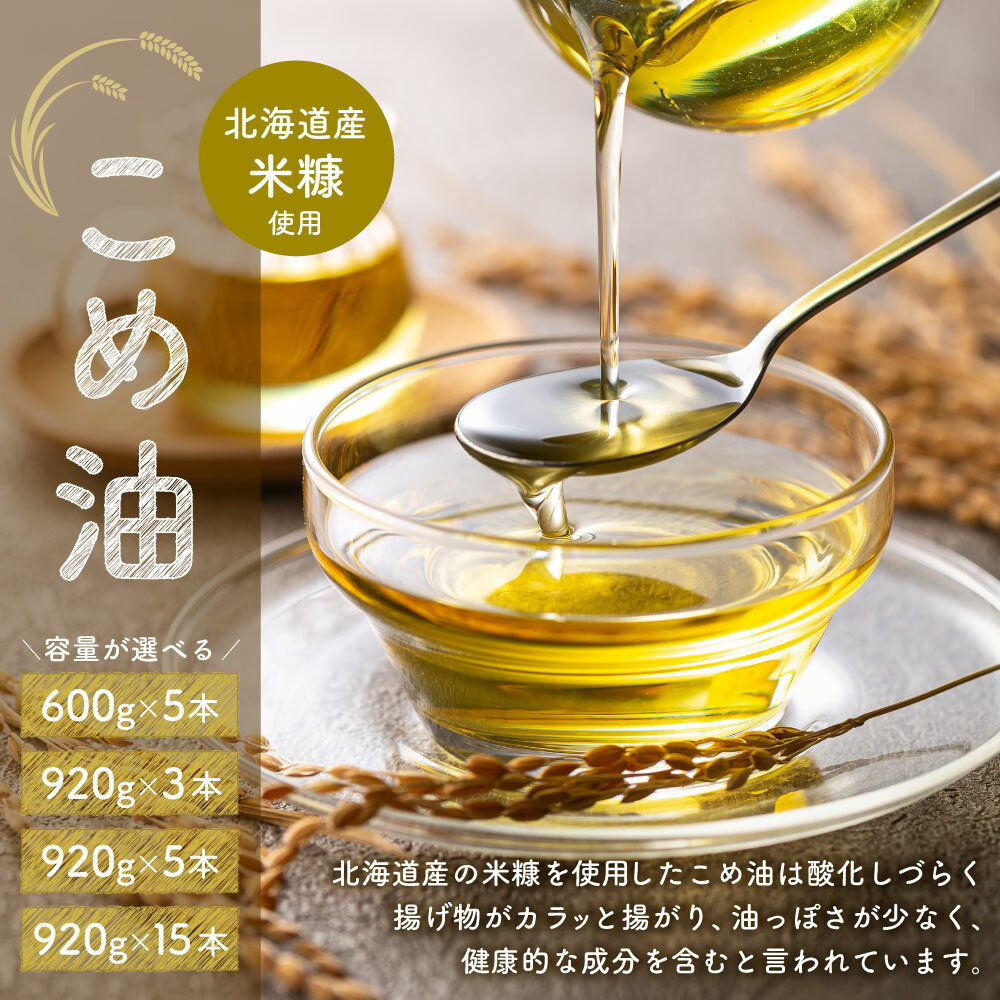 - 【ふるさと納税】〈選べる容量〉北海道産米糠使用 こめ油 【2025年10月上旬より順次発送】 600g×5本/920g×3本/5本/15本 国産 北海道産 米糠 米 お米 食用 料理用 揚げ物 油 植物油 米サラダ油 サラダ油 オイル 油製品 北海道 深川市