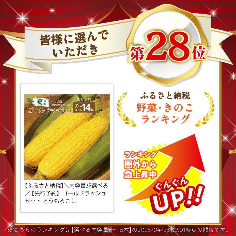- 【ふるさと納税】【先行予約】 \内容量が選べる/ ゴールドラッシュ 7本 / 14本 セット 朝採れ 新鮮 泉佐野市産 とうもろこし 数量限定 夏収穫 甘みが強い 粒皮がやわらかい 泉州TONOファーム 国産 お取り寄せ お取り寄せグルメ 泉佐野市 送料無料