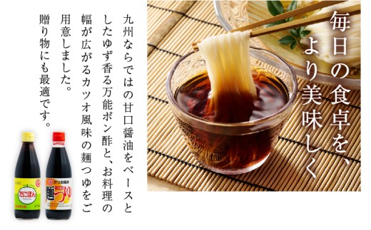 ポン酢&麺つゆセット(合計2本) 食品 加工品 万能調味料 めんつゆ 九州醤油 ゆず果汁 甘口 カツオ風味 2倍濃縮 餃子のタレ 肉料理 野菜料理 炒め物 だし巻き卵 詰め合わせ おすすめ ギフト プレゼント 贈り物 おすそ分け 宮崎県 日南市 送料無料_ZZ25-25