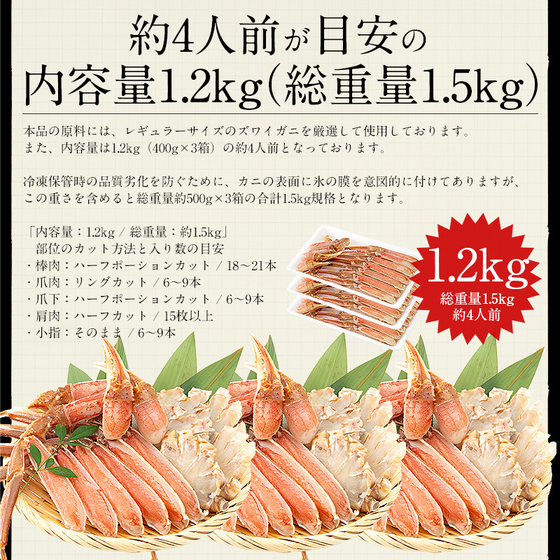 【12月26日~12月31日着(指定日不可)】年内お届け先行予約受付中!カット済ズワイ蟹ハーフポーション1.2kg(400g × 3箱) [053-b009_A-b]【敦賀市ふるさと納税】
