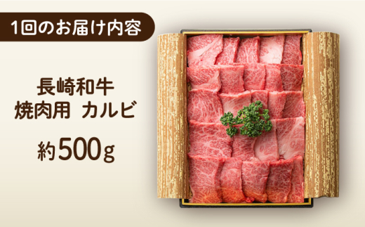 【6回定期便】 長崎和牛 焼肉 カルビ 約500g 長与町/ワタナベ商店 [ECT023] 国産 長崎和牛 和牛 カルビ かるび カルビ肉 焼き肉 牛肉 冷凍 ソース付き ギフト お祝い 定期 定期便