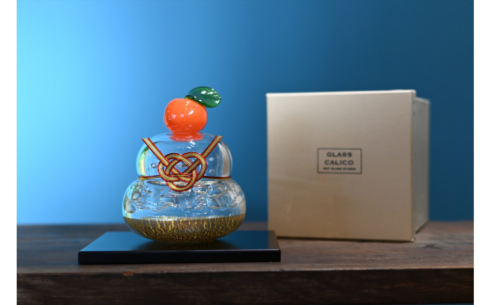 ガラスの鏡餅(黒台付き)銀箔使用<Lサイズ>【鏡餅 吹きガラス工房 ガラス お正月 鏡餅約13cm×約10cm 黒台15cm×12cm ハンドメイド 職人手作り 工芸品 伝統工房で作成 老舗ガラス工房 神奈川県 小田原市 】 142069_CH005