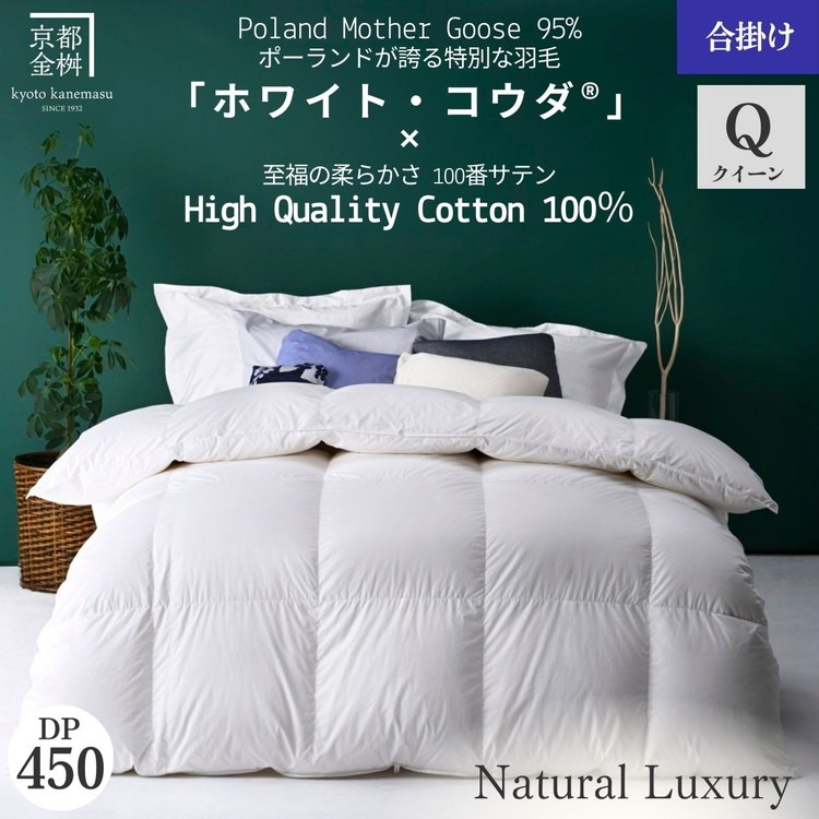 - <京都金桝>高級 羽毛布団 合掛け クイーン 綿100% MPキルト(移動防止) ポーランドホワイトマザーグースダウン95% 1.2kg「ホワイト・コウダ®」エモシオン《羽毛ふとん 掛け布団 春 秋 冬 暖か 無地》
