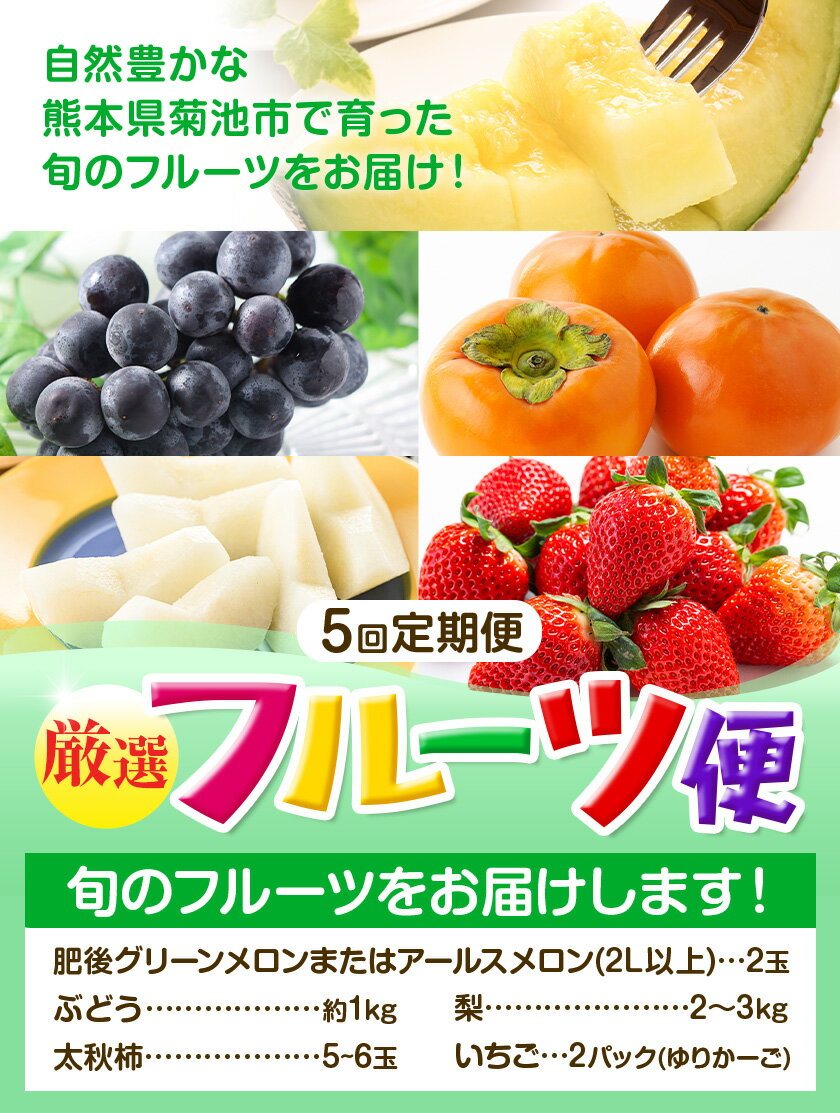 【ふるさと納税】【定期便計5回】厳選フルーツ便(メロン・ぶどう・梨・太秋柿・いちご) 【メロンドーム】 菊池市産 熊本県産 九州産 果物 肥後グリーンメロン アールスメロン ぶどう 梨 柿 いちご(ゆりかーご) フルーツ 旬 送料無料 《お申込み月の翌月から出荷開始》
