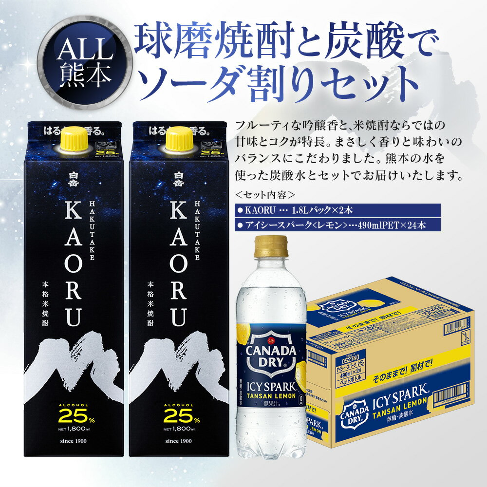 - 【ふるさと納税】球磨焼酎と炭酸でソーダ割りセット!KAORU 1.8Lパック×2本 + アイシースパークレモン 490mlPET×24本 パック 酒 お酒 アルコール 25度 焼酎 炭酸水 ソーダ割り セット 球磨焼酎 ハイボール 常温 九州 熊本県 送料無料