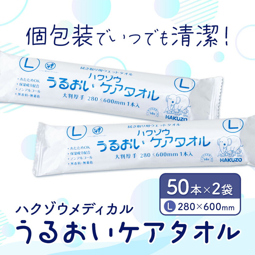 - 【ふるさと納税】ハクゾウうるおいケアタオル L 大判厚手 280×600mm 50本入×2袋 ハクゾウメディカル《30日以内に出荷予定(土日祝除く)》熊本県 菊池市 うるおいケアタオル タオル 大判 厚手 Lサイズ 個包装 ディスポタオル 使い捨て ウェットタオル 医療 介護 防災グッズ