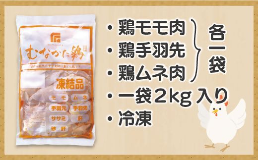 宗像産ブランド鶏【むなかた鶏】食べ比べセット(モモ肉、ムネ肉、手羽先各2kg)(平飼い)【JAほたるの里】_HA1424