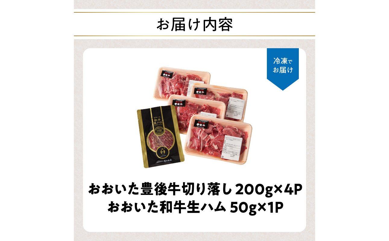 - 【A01149】【期間限定】おおいた豊後牛切り落し 200g×4P+おおいた和牛生ハム 50g×1P