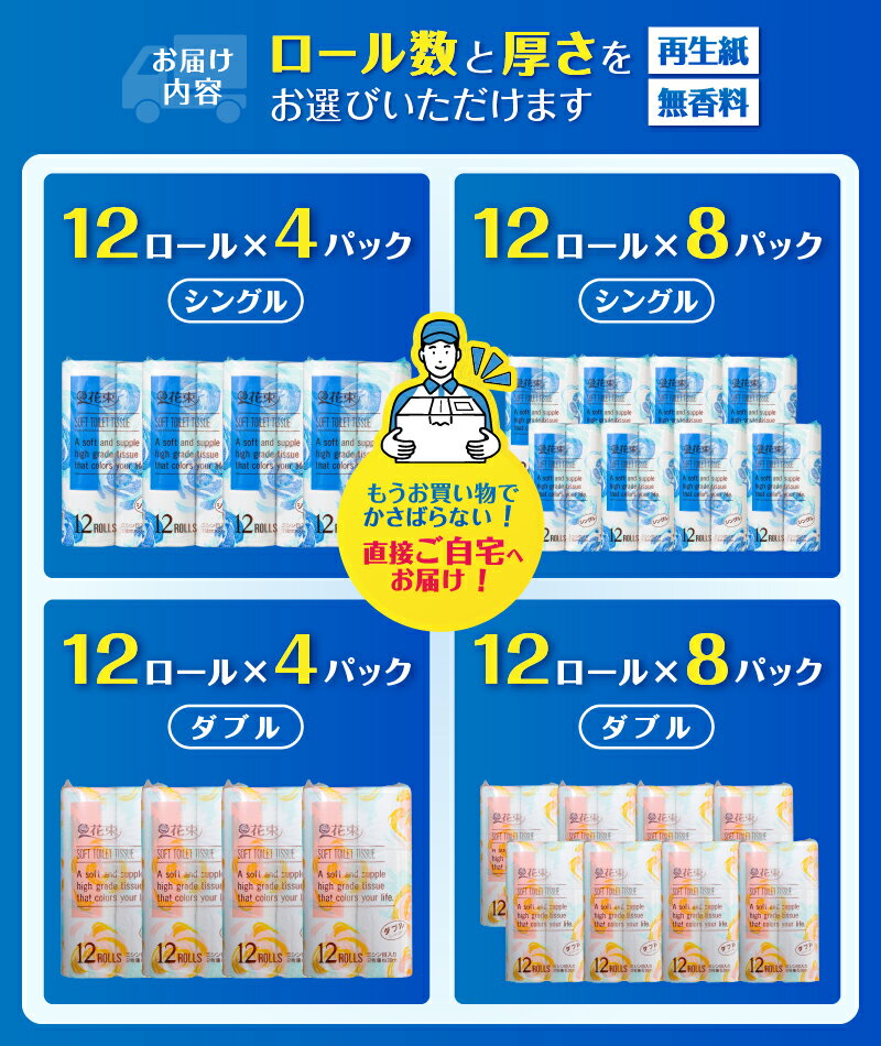 - 【ふるさと納税】 《物価高騰特別寄附額》 花束 トイレットペーパー 選べる厚さ&ロール数 シングル/ダブル 48/96ロール 再生紙100% 日用品 消耗品 備蓄 防災 生活雑貨 生活用品 生活必需品 無香料 富士市 [sf002-287-362]