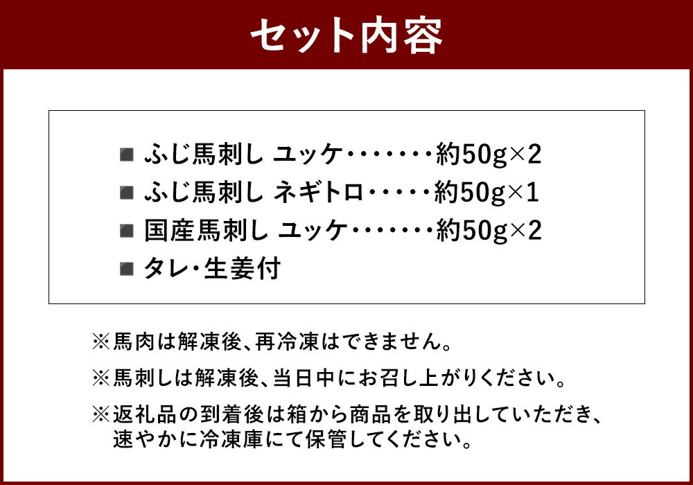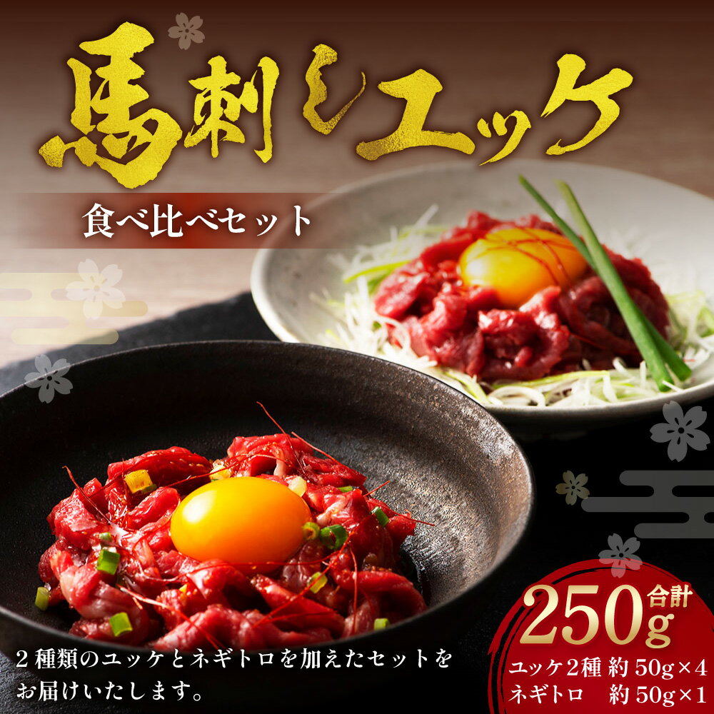 - 【ふるさと納税】熊本特産馬刺し ユッケ食べ比べセット ふじ馬刺しユッケ×2・ネギトロ×1・国産馬刺しユッケ×2 計250g 各50g タレ・生姜付き 馬刺 馬肉 お肉 詰め合わせ たれ しょうゆ コチジャン コチュジャン しょうが ショウガ 冷凍 熊本県 相良村 送料無料