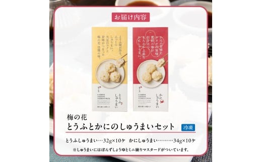 - 梅の花 とうふとかにのしゅうまいセット各10個入り_しゅうまい 食べ比べ セット 梅の花 名物 とうふしゅうまい かにしゅうまい 各 10個入り たれ からし 付き 化学調味料 合成保存料 合成着色料 無添加 大豆のコク 素材の味 惣菜 おかず 福岡県 久留米市 お取り寄せ 冷凍 送料無料_Cx215