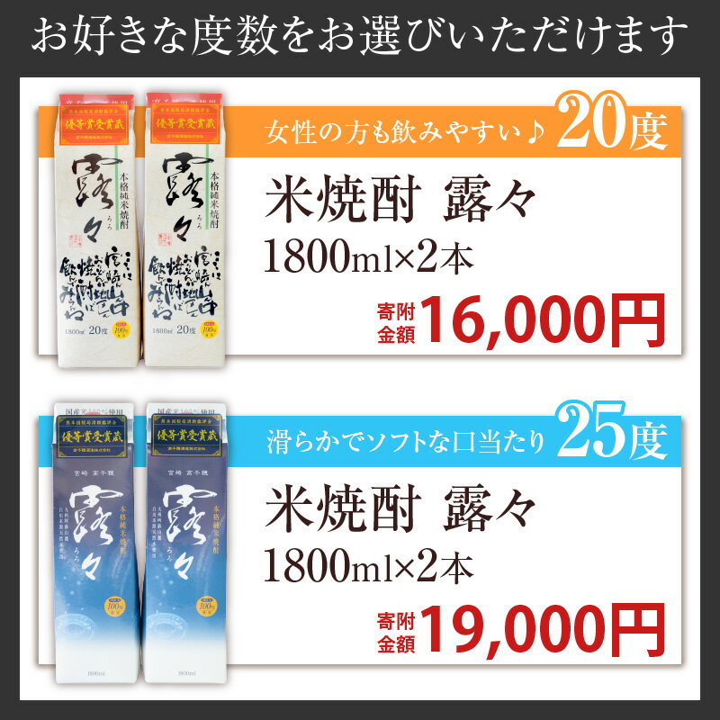 - 【ふるさと納税】【選べる度数】本格米焼酎 露々 1800ml×2本(紙パック) 酒 お酒 アルコール 焼酎 米焼酎 純米焼酎 贈り物 ギフト プレゼント お歳暮 お祝い 記念日 誕生日 パーティー 詰め合わせ 焼酎セット ロック お湯割り 高千穂町