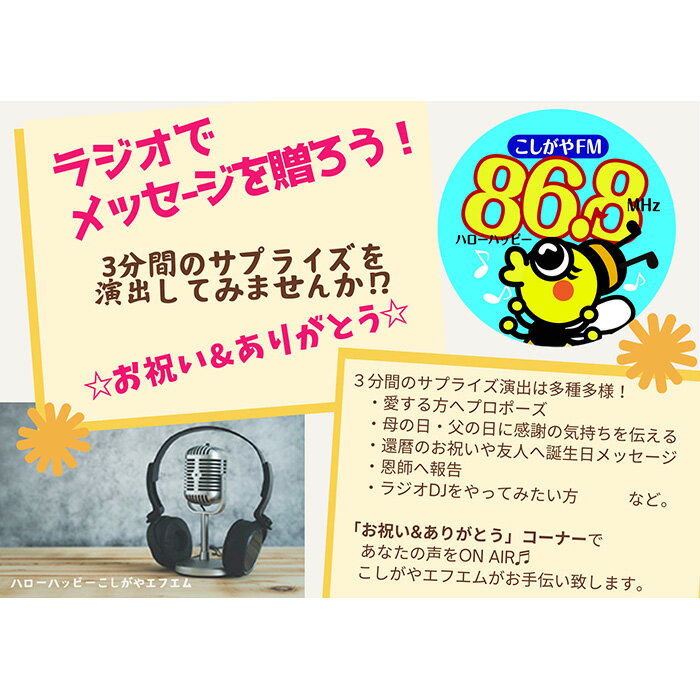 - 【ふるさと納税】お祝い&ありがとうメッセージをラジオでプレゼント【ラジオ出演体験】3分 / こしがやエフエム サプライズ演出 プロポーズ 還暦祝い お誕生日 母の日 父の日 送料無料 埼玉県 No.257