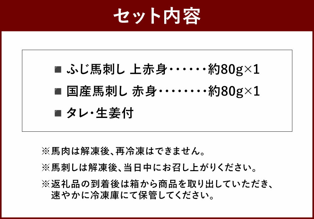 【ふるさと納税】熊本特産馬刺し 赤身食べ比べセット ふじ馬刺し上赤身・国産馬刺し赤身 計160g 各80g タレ・生姜付き 馬刺 馬肉 お肉 詰め合わせ たれ 醬油 しょうゆ しょうが ショウガ 冷凍 熊本県 相良村 送料無料