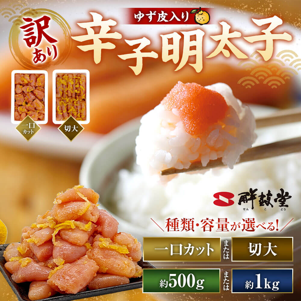 【ふるさと納税】<選べるサイズ・内容量>【訳あり】辛子明太子 ゆず皮入り 一口カット・切大 500g×1箱・計1kg(500g×2箱) すけそうだらの卵 魚卵 めんたいこ 柚子 ユズ ご飯のお供 おにぎりの具材 明太パスタ 魚介類 水産物 海産物 冷凍 福岡県 太宰府市 送料無料