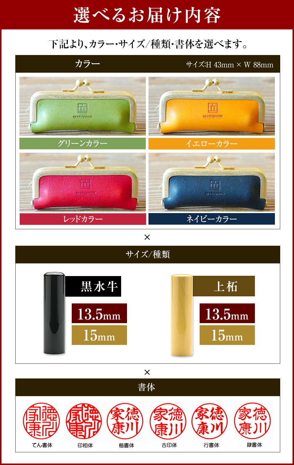 - 【ふるさと納税】<選べるカラー・サイズ・印材>実印 イタリアンオイルレザーのがま口印鑑ケース付き グリーン・イエロー・レッド・ネイビー 13.5mm・15mm 黒水牛 上柘 てん書体 印相体 楷書体 古印体 行書体 隷書体 ハンコ 銀行印 認印 送料無料