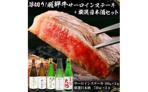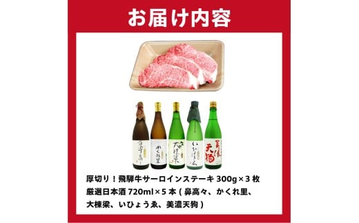 4-1 厚切り!飛騨牛サーロインステーキ300g×3枚 + 厳選日本酒720ml×5本【岐阜県 可児市 酒 日本酒 飲料 地酒 アルコール 手作り ギフト プレゼント お祝い 目録 肉 牛肉 】