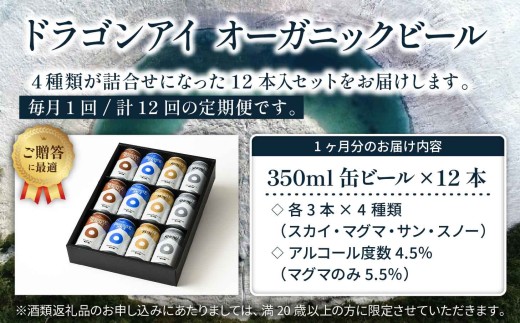 - 【ご贈答用】 オーガニックビール ドラゴンアイ 「4種飲み比べ」 350ml缶×12本セット 12ヶ月定期便 暁ブルワリー / クラフトビール 地ビール 飲み比べ 缶ビール ビール 晩酌 宅飲み 家飲み 贈答 プレゼント ギフト 贈り物 誕生日 詰合せ 酒 お酒 岩手県 八幡平市 おすすめ オススメ