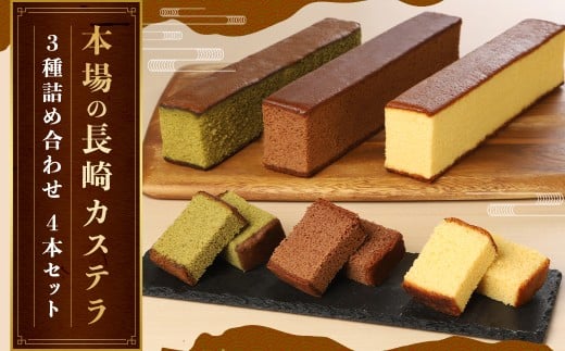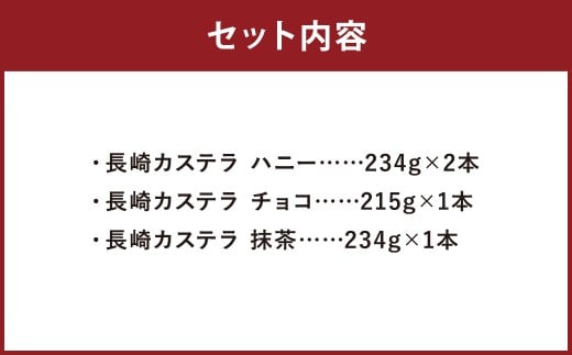 【7営業日以内発送】【伝統に育まれた本場の長崎カステラ】 人気の3種詰め合わせ! ハニー 2本& チョコ、抹茶 各1本 計4本セット / 菓秀苑 森長 カステラ 和菓子 菓子 お菓子 スイーツ デザート 詰め合わせ 詰合せ セット 九州 長崎県 長崎市 常温