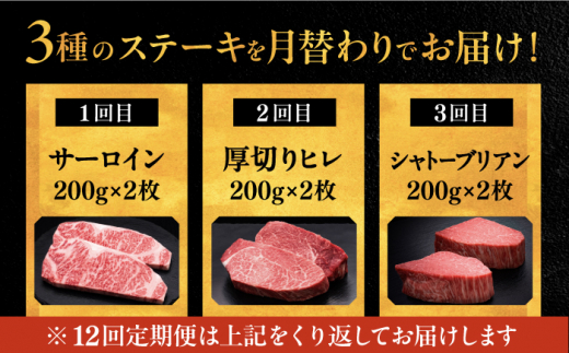 【全12回定期便】博多和牛 食べ比べ ステーキ 定期便 ( サーロイン / ヒレ / シャトーブリアン )毎月200g×2枚お届け! ▼ 牛肉 肉 にく 希少部位 希少肉 レア ステーキ セット 高級 和牛 記念日 定期便 食べくらべ 桂川町/久田精肉店 [ADBM141]