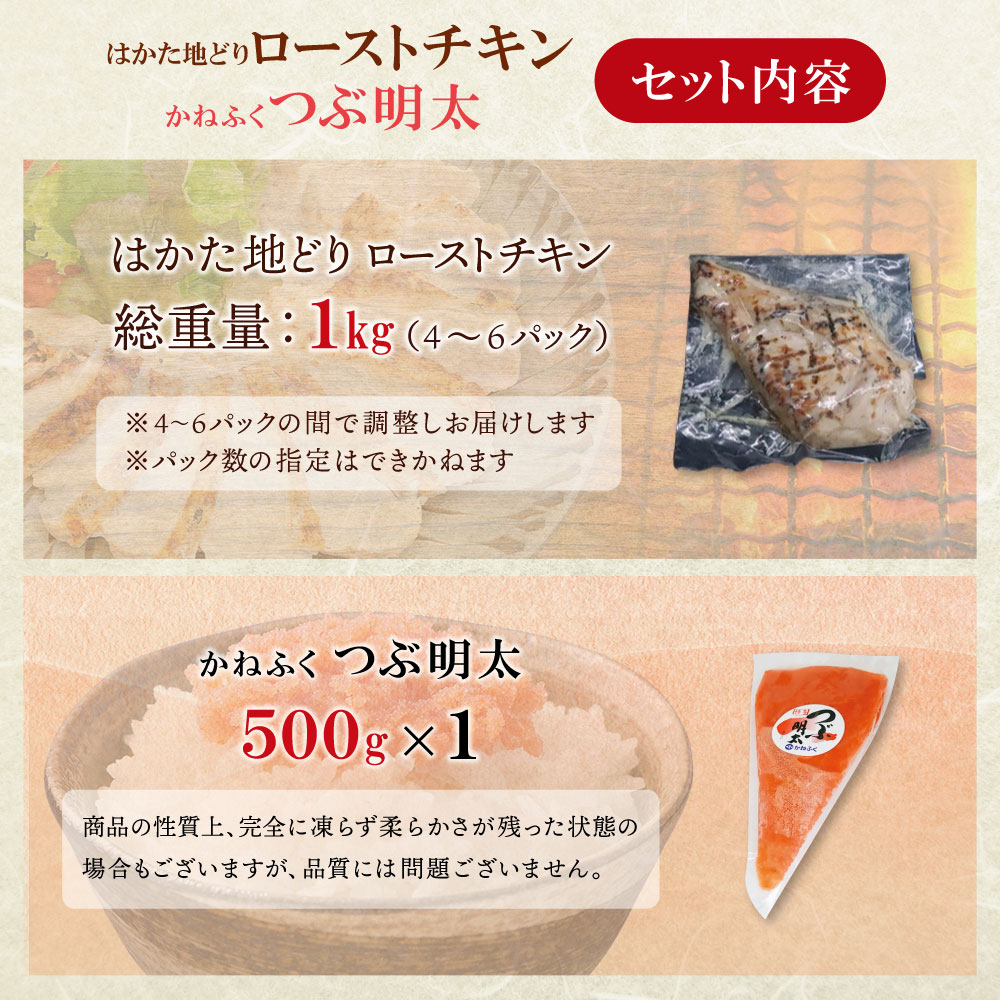 - 【ふるさと納税】 総重量1.5kg!博多地どりローストチキン・つぶ明太セット 詰め合わせ チキン 惣菜 パーティ ごちそう クリスマス 冬 人気 地鶏 はかた地どり サラダチキン ギフト 明太子 かねふく バラ子 チューブ 簡単 福岡 福智 送料無料